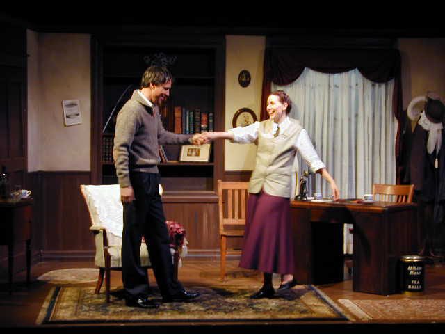 Judy Straalsund's new play juxtaposes the realities of Sayers' life with scenes from her writings. The audience sees the dashing Lord Peter living in a world of freedom and finery, while a very plain Sayers works long hours and scrimps on groceries. The daughter of a poor pastor, Sayers had to support herself and began her literary career writing slogans for an advertising agency, while crafting her Lord Peter novels in her spare time.